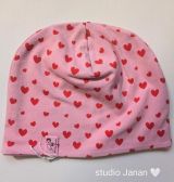Čepice se vzorem červených srdíček na růžovém podkladu.