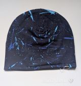 Čepice se vzorem modrých cákanců na temně modrém podkladu.
