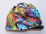 Čepice se vzorem nápisů bang, boom, splash, wow a jiné.