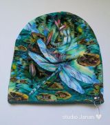 Čepice se vzorem velkých vážek na zelenkavém podkladu.