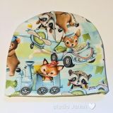 Čepice se vzorem zvířátek v dopravních prostředcích.