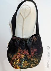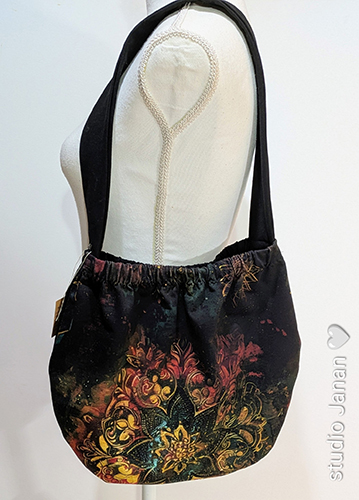 Látková taška šitá z teplákoviny v dekoru hnědozelených mandal.