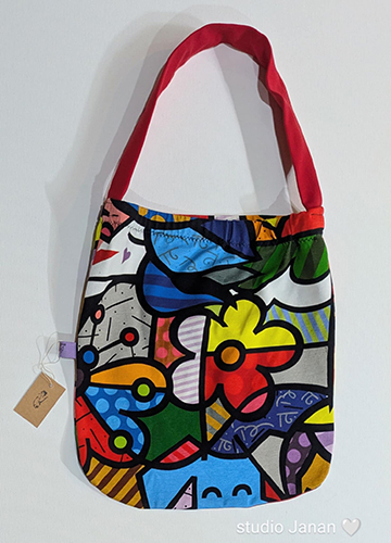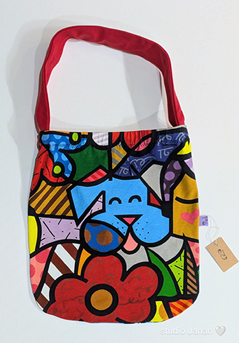 Látková pestrá taška z úpletu se psem a květinami. Ucho červené.