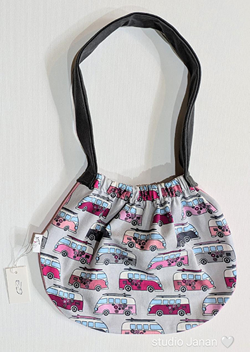 Malá taška s autobusy s šedivým uchem a růžovým zadním dílem.