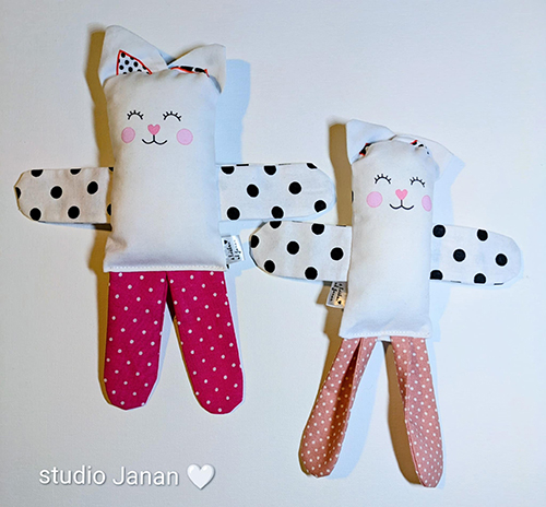 Šitý z plátna. Výška i s oušky a nožičkami 21cm, šířka tělíčka 6cm s tlapkami 20cm.