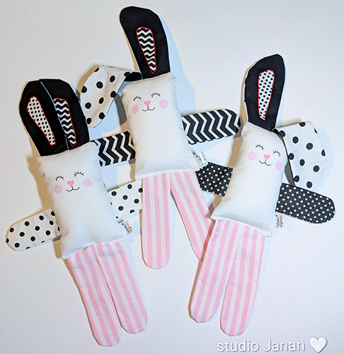 Šítý z plátna. Výška i s oušky a nožičkami 30cm, šířka tělíčka 6cm s tlapkami 20cm.