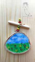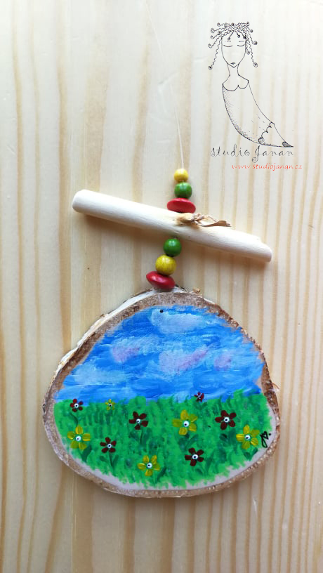 Malba a kresba propojená na dřevěném špalíčku, doladěna dřívky a korálky na vlasci.