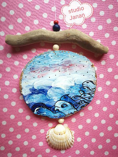 Malované moře s rybkami na dřevěném špalíčku, lakované. Doplněno korálky, mušličkou a dřívkem.