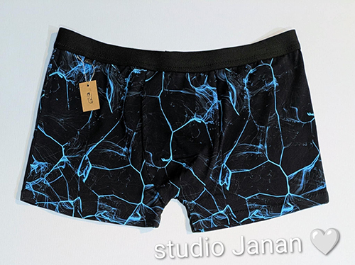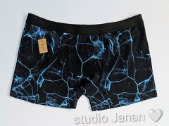 Pánské boxerky v dekoru modrých blesků na černém podkladu. Guma v pase je velmi příjemná a přizpůsobí se křivkám. Šité z úpletu. Vložka je všita bezešvě.