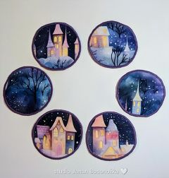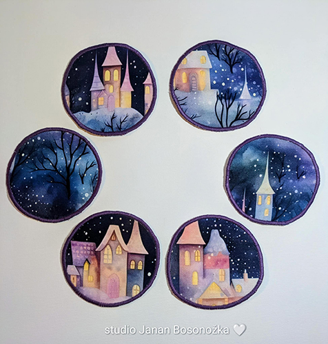 Látkové podtácky šité z teplákoviny a podžehlené ronofixem, jsou tedy příjemné na dotek a pevné. S dekorem zimního městečka.