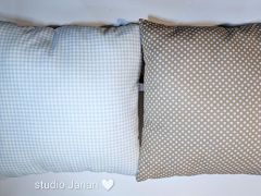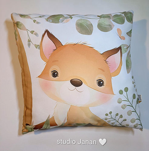 Polštářek s lištičkou. Z druhé strany má šedou kostku plátno, nebo hnědý puntík, vyberte si z možností.