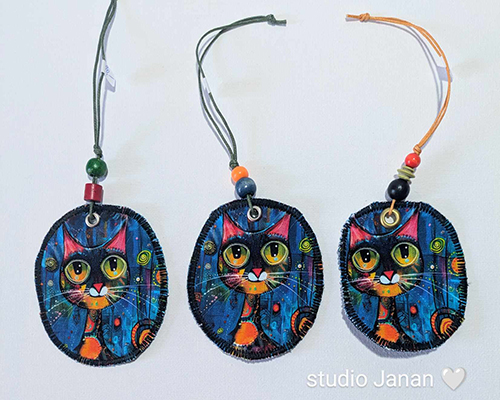 Přívěsek s kočkou s korálky, podžehlený ronofixem a entlovaný.