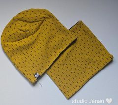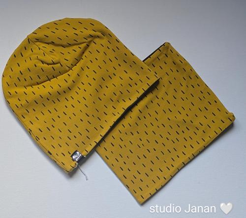Set čepice a nákrčník s čárky na okr podkladu.