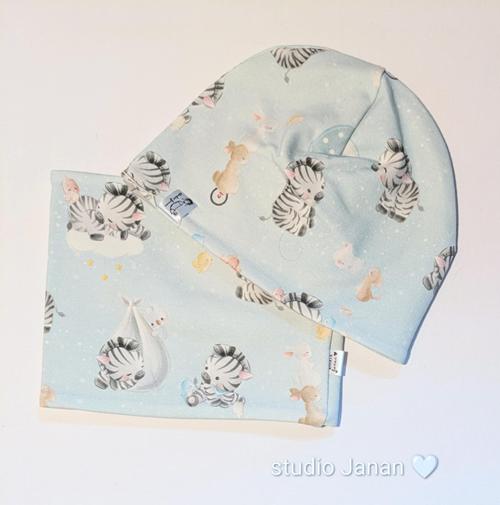 Set čepice a nákrčník s mimi vzorem zeber a králíčků a myšek na modrém podkladu.