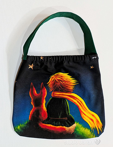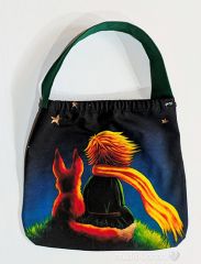Taška s malým princem a liškou. Zadní díl černý a ucho zelené.