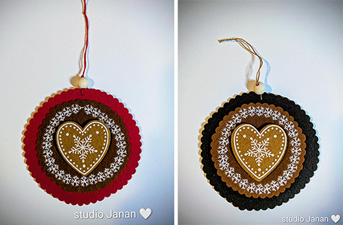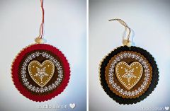 Vánoční ozdoba z plsti s plstěným srdíčkem s vyšívanými vločkami a dřevěným korálkem.