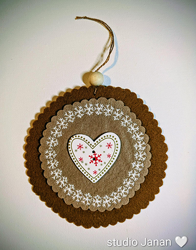 Vánoční ozdoba z plsti s dřevěným srdíčkem s vyšívanými vločkami a dřevěným korálkem.