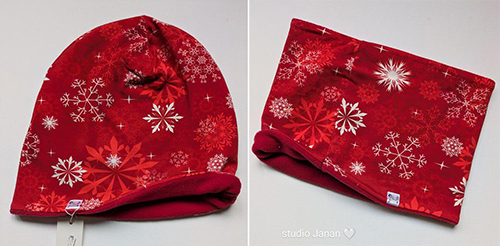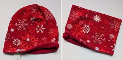 Čepice a nákrčník zateplený fleecem v dekoru vloček na červeném podkladu.